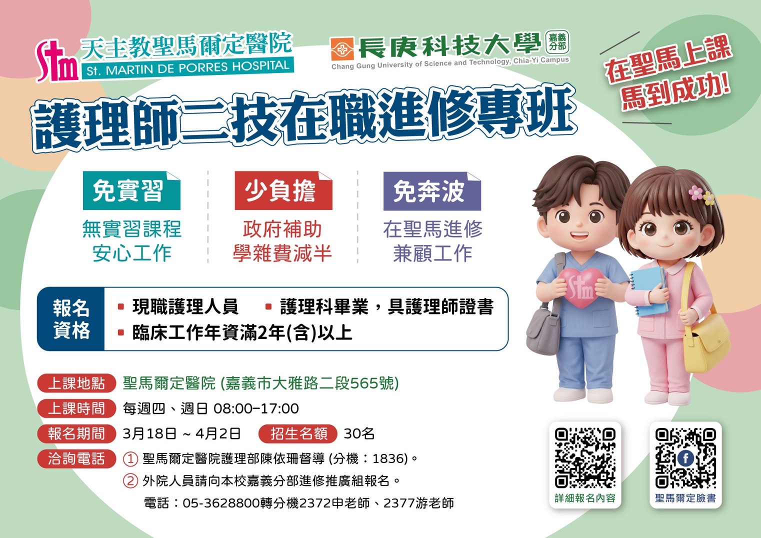 各位會員平安 轉知進修訊息: 長庚科技大學【護理二技在職專班】將於天主教聖馬爾定醫院開課,歡迎有興趣會員報名參加 ◎報名日期:115年03月18日-115年04月02日17:00止 ◎相關報名資訊詳如海報及相關連結 https://recruit.cgust.edu.tw/p/406-1044-81681,r7095.php